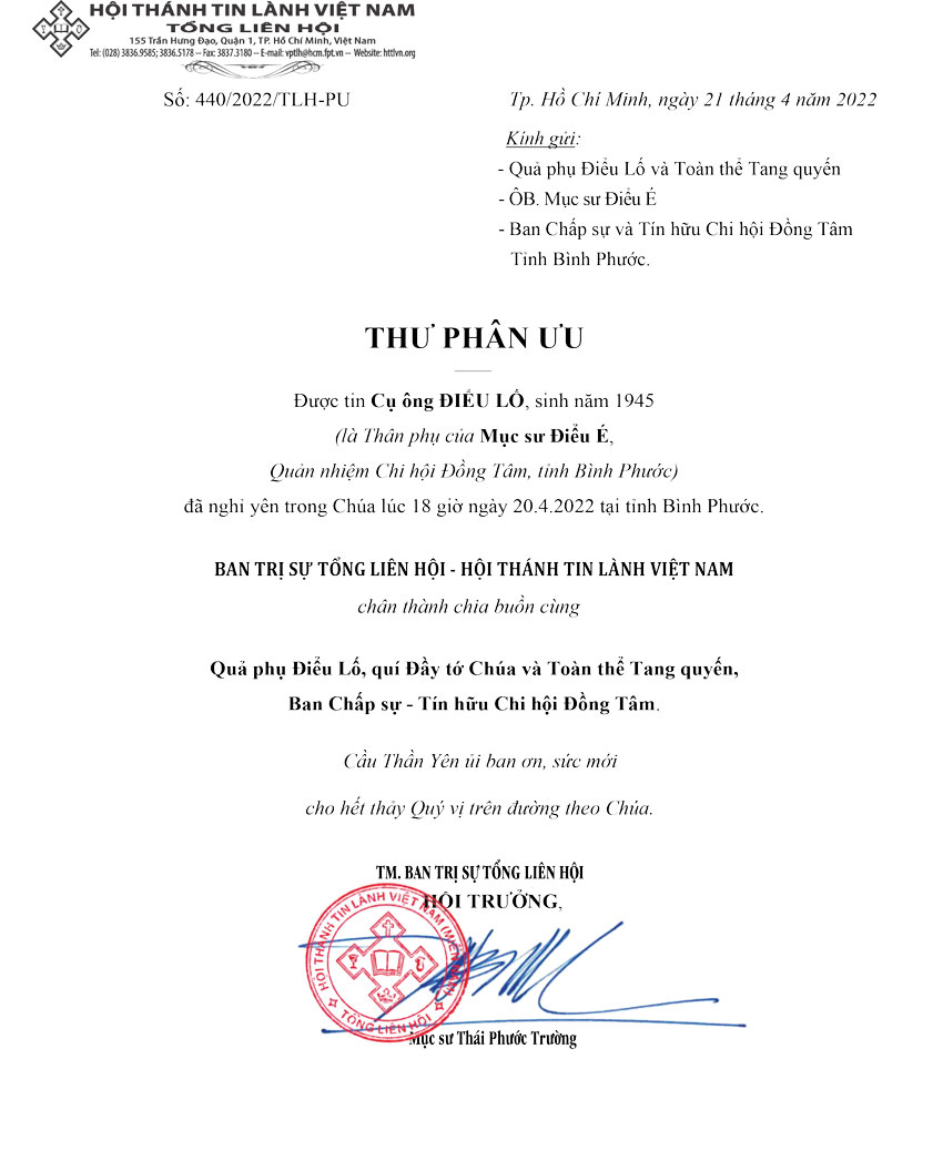 Thư Phân Ưu Cùng Tang Quyến Của Mục Sư RMAH SOL