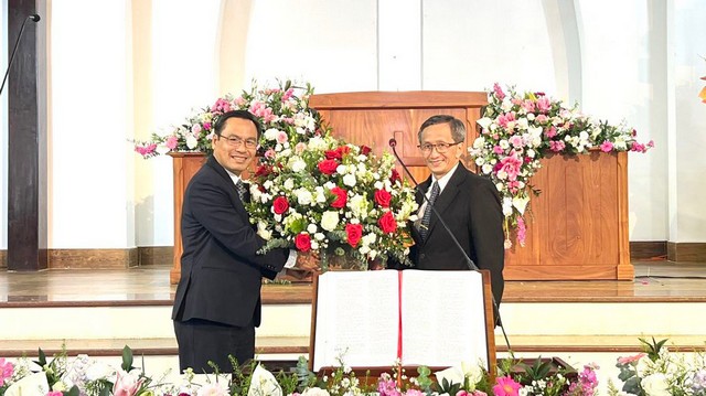 Đại diện Ban Chấp sự Hội Thánh Đà Lạt tặng hoa chúc mừng Hội đồng