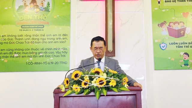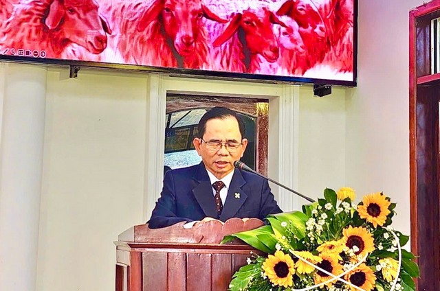 Mục sư Nguyễn Ngọc Bình, Trưởng BĐD tỉnh Bình Định, cầu nguyện khai lễ và làm chứng về công việc Chúa tại Bình Định