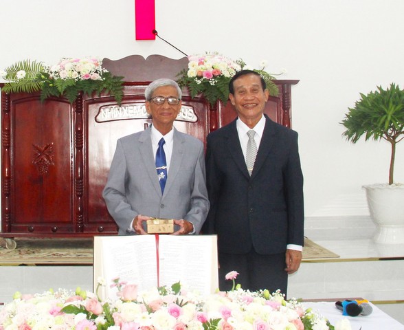 Mục sư Nguyễn Thế Hiển trao Giấy Chứng nhận và cầu nguyện cho Mục sư Nguyễn Văn Lân