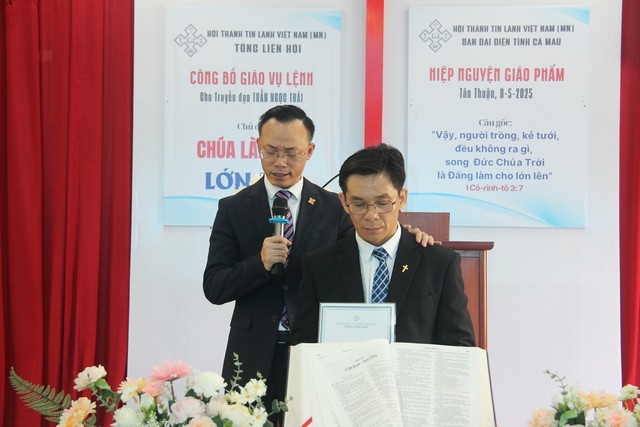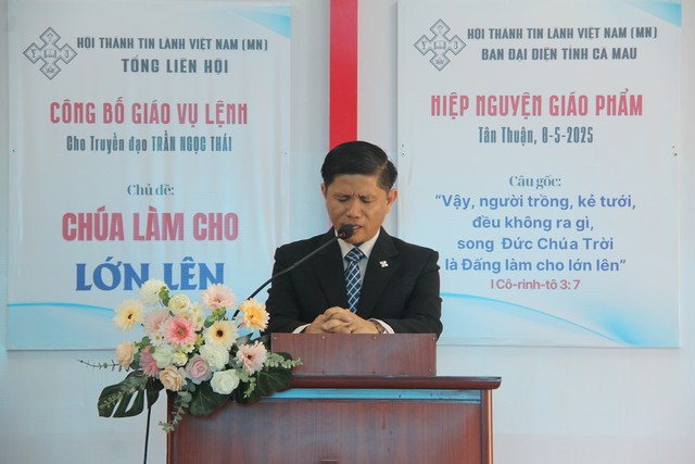 Nhân kỳ hiệp nguyện Giáo phẩm lần này Mục sư Hồ Nguyên Kha thay cho lãnh đạo Giáo hội công bố Giáo vụ lệnh và cầu nguyện cho chức vụ của Truyền đạo Trần Ngọc Thái tại Hội Thánh Tân Thuận (Chi Hội nội bộ)