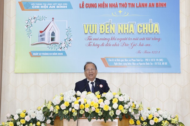 HTTLVN.ORG – Vào lúc 9g00 ngày 22/04/2026, trong bầu không khí trang nghiêm và đầy dẫy sự vui mừng, Chi Hội An Bình (tỉnh Đồng Tháp) đã long trọng tổ chức Lễ Cung hiến ngôi đền thờ mới lên cho Ba Ngôi Đức Chúa Trời. Buổi lễ có sự hiện diện của: Mục sư Phan Vĩnh Cự (Phó Hội trưởng I) làm chủ lễ, diễn giả cho chương trình; Mục sư Nguyễn Bình Tín (Ủy viên Tổng Liên Hội – Mục vụ tỉnh Đồng Tháp) và khoảng 650 tôi con Chúa.