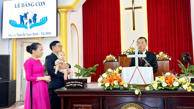 Mục sư Nguyễn Ngọc Bình, Thư ký Ban Đại diện, thực hiện nghi thức dâng cháu Ngô Hoài Thương, con của Mục sư Ngô Nhơn Thành cho Chúa