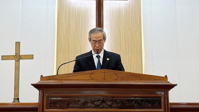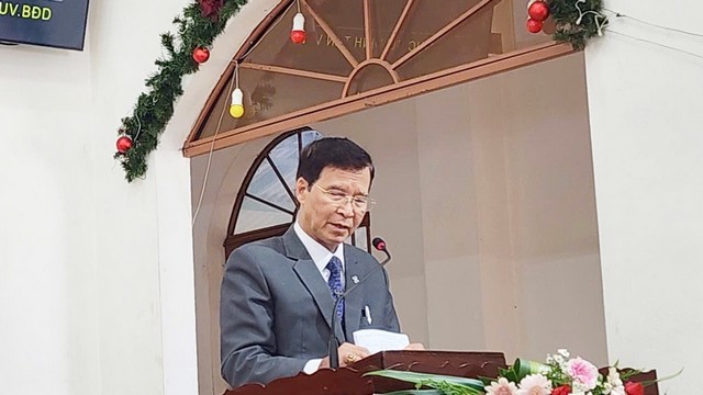 Mục sư Nguyễn Ngọc Bình, Trưởng Ban Đại diện tỉnh Bình Định, làm chứng công việc Chúa trong tỉnh và những vấn đề chung cầu nguyện: