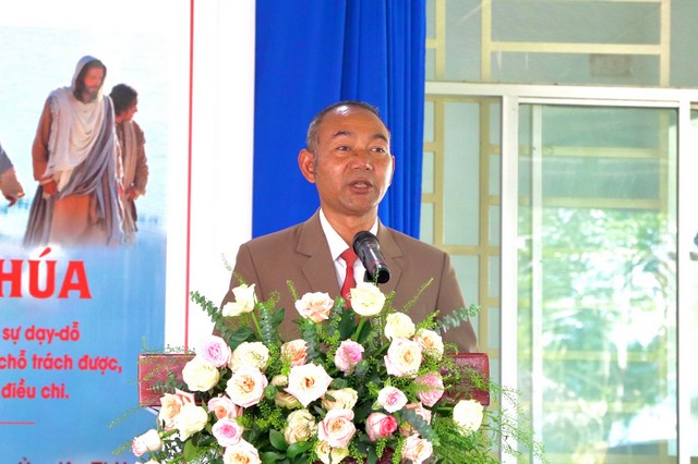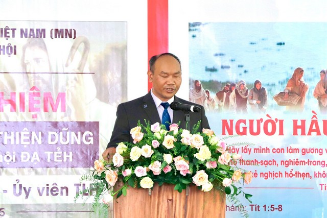 Mục sư K’ Brọp, Ủy viên Tổng Liên Hội – Mục vụ tỉnh Lâm Đồng, rao giảng Lời Chúa với đề tài: “Người Hầu Việc Chúa” dựa trên nền tảng Kinh Thánh Tít 2:7-8. Người chăn bầy là người được Đức Chúa Trời kêu gọi, chính vì vậy tôi tớ Chúa phải là người không chỗ trách được, có phẩm chất và gương mẫu để chăn dắt bầy chiên mà Chúa giao phó.