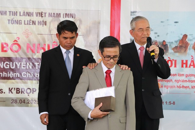 Mục sư Bùi Phụng, UV TLH – Mục vụ tỉnh Lâm Đồng, trao giáo vụ lệnh và hiệp với MS K’ Brọp cầu nguyện cho Tân Quản nhiệm