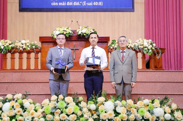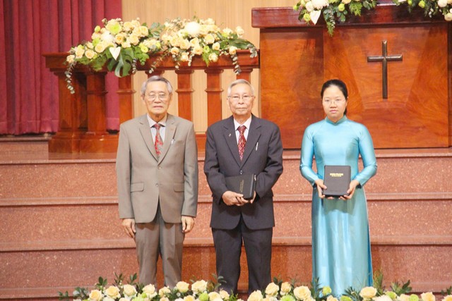 Mục sư Hội trưởng cũng tặng bản Kinh Thánh cập nhật năm 2025 cho ông Phan Nam Sinh, con trai cố nhà văn Phan Khôi, người góp phần hiệu chỉnh bản Kinh Thánh năm 1925