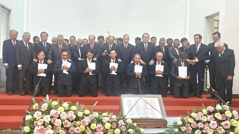 Trang chủ Đồng Nai: Lễ Tấn Phong Mục sư Khu vực II Mục sư Nguyễn Hữu Bình,Chủ tịch HĐTV&TPMS KV II hiệp với Mục sư đoàn đặt tay cầu nguyện.