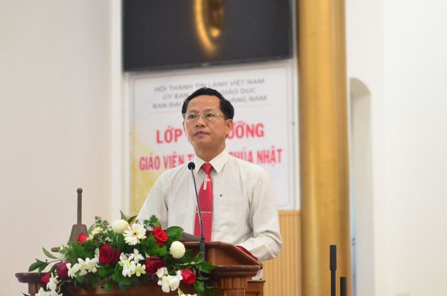 Mục sư Võ Đình Đán, Trưởng ban Đại diện Tin Lành tỉnh Quảng Nam, tâm tình với quý giáo viên với chủ đề “Người Trung Thành”, nương trên Kinh Thánh I Cô-rinh-tô 4:1-2. Lời Chúa khích lệ quý giáo viên thêm lòng yêu mến Chúa, vững lòng và trung thành phục vụ Chúa trong công tác dạy Trường Chúa nhật.