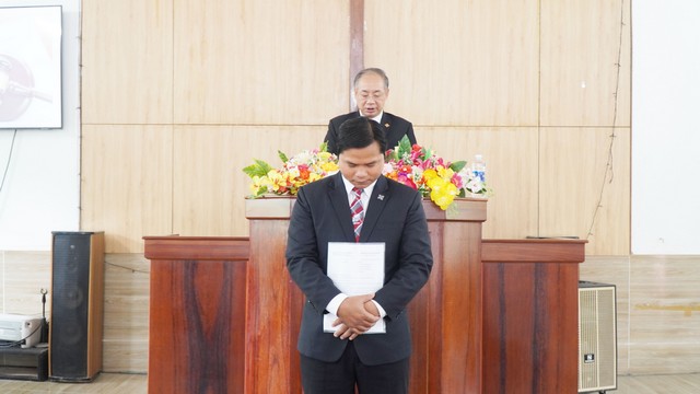 Mục sư Nguyễn Hải Bằng thông tin công việc của Giáo hội và thay cho lãnh đạo Giáo hội trao Giáo vụ lệnh và cầu nguyện cho MSNC Hồ Văn Phúc, kiêm nhiệm Chi Hội Hướng Lộc (nội bộ)