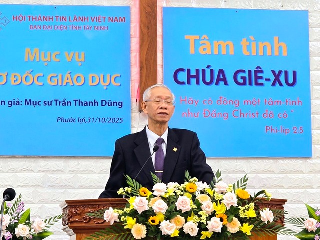 HTTLVN.ORG – Lúc 8g30 ngày 31/10/2025, Ủy Ban Cơ Đốc Giáo Dục Tổng Liên Hội (UB CĐGD TLH) kết hợp với Ban Đại diện Tin Lành tỉnh Tây Ninh tổ chức bồi dưỡng Mục vụ Cơ Đốc Giáo dục tại nhà thờ Tin Lành Phước Lợi. Diễn giả là Mục sư Trần Thanh Dũng, Thành viên UB CĐGD TLH. Có hơn 120 người tham dự, gồm một số Giáo phẩm và các Giáo viên Trường Chúa nhật đến từ các Hội Thánh trong tỉnh.
