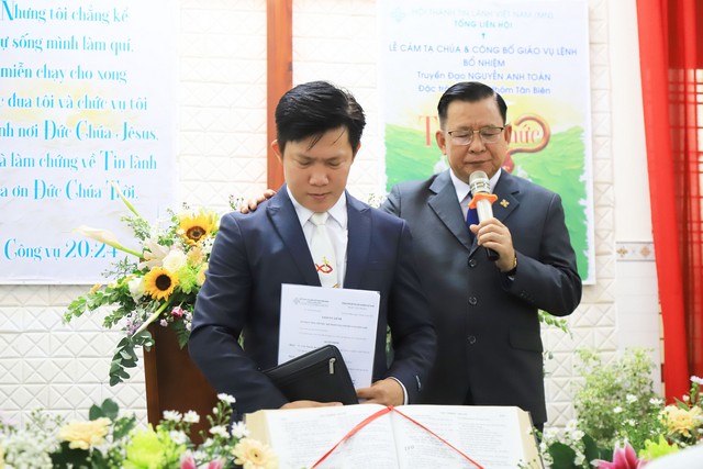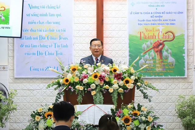 Mục sư Nguyễn Bình Tín công bố Giáo vụ lệnh và cầu nguyện cho tân Quản nhiệm Chi Hội Tân Biên