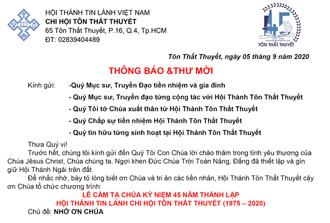 Thông Báo & Thư Mời Dự Lễ Cảm Tạ Chúa KỶ Niệm 45 Năm Thành Lập HTTL TÔN THẤT THUYẾT