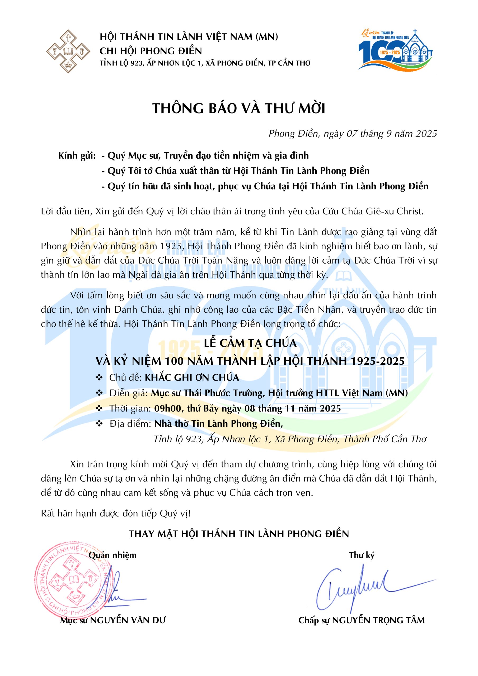 Thông Báo Thông Báo & Thư Mời Lễ Cảm Tạ Chúa Và Kỷ Niệm 100 Năm Thành Lập HTTL PHONG ĐIỀN 14/10/2025 3466