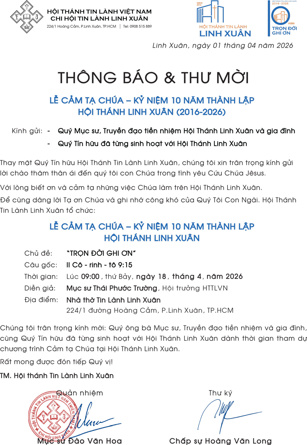 Thông Báo Thông Báo & Thư Mời V/v Lễ Cảm Tạ Chúa – Kỷ Niệm 10 Năm Thành Lập HTTL LINH XUÂN (2016-2026) 07/04/2026 47