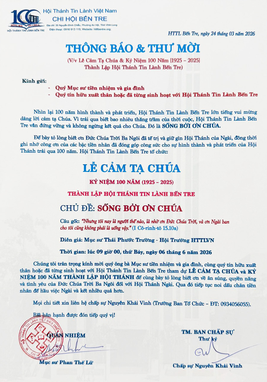 Thông Báo Thông Báo & Thư Mời V/v Lễ Cảm Tạ Chúa & Kỷ Niệm 100 Năm Thành Lập HTTL Bến Tre 24/03/2026 30