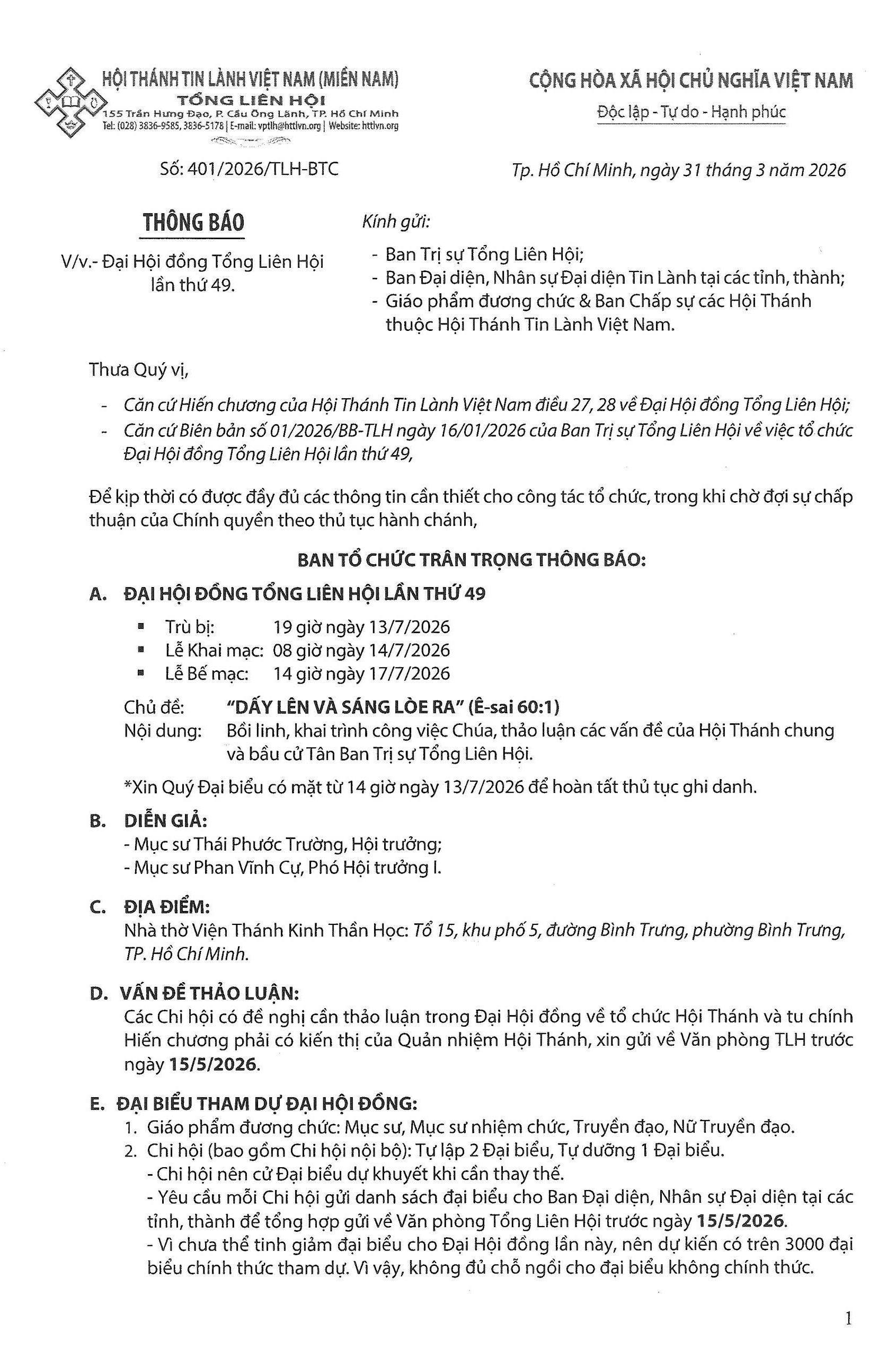 Thông Báo V/v Đại Hội Đồng Tổng Liên Hội Lần Thứ 49