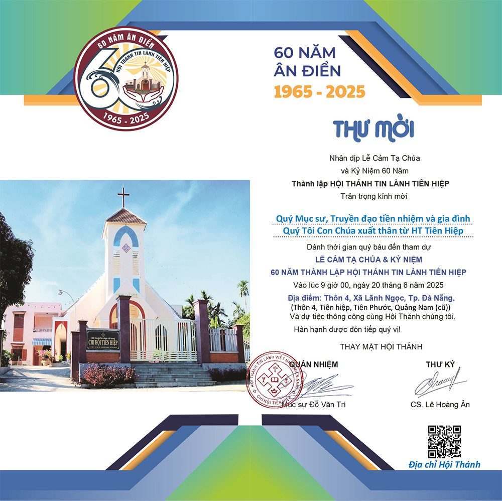 Thông Báo Thông Báo V/v Thư Mời Nhân Dịp Lễ Cảm Tạ Chúa và Kỷ Niệm 60 Thành Lập HTTL Tiên Hiệp 18/07/2025 7864