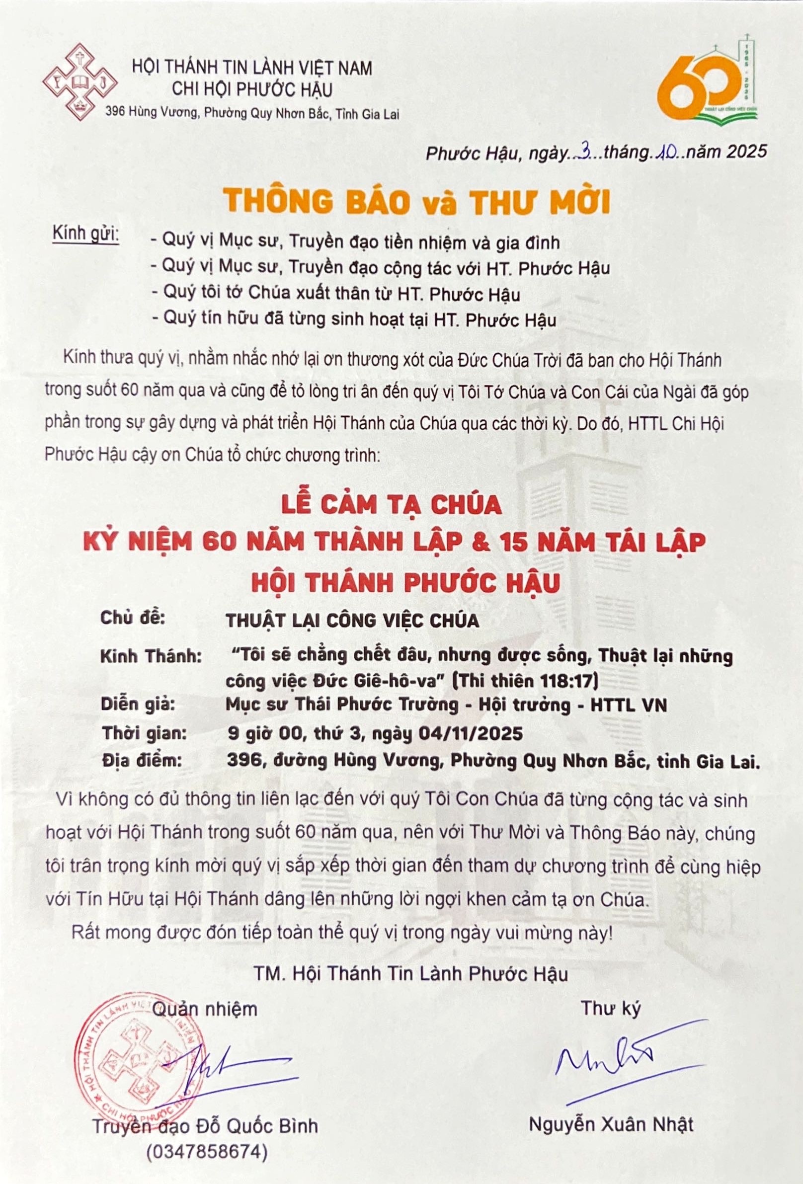 Thông Báo Thông Báo và Thư Mời V/v Lễ Cảm Tạ Chúa Kỷ Niệm 60 Năm Thành Lập & 15 Năm Tái Lập HTTL PHƯỚC HẬU 14/10/2025 3013