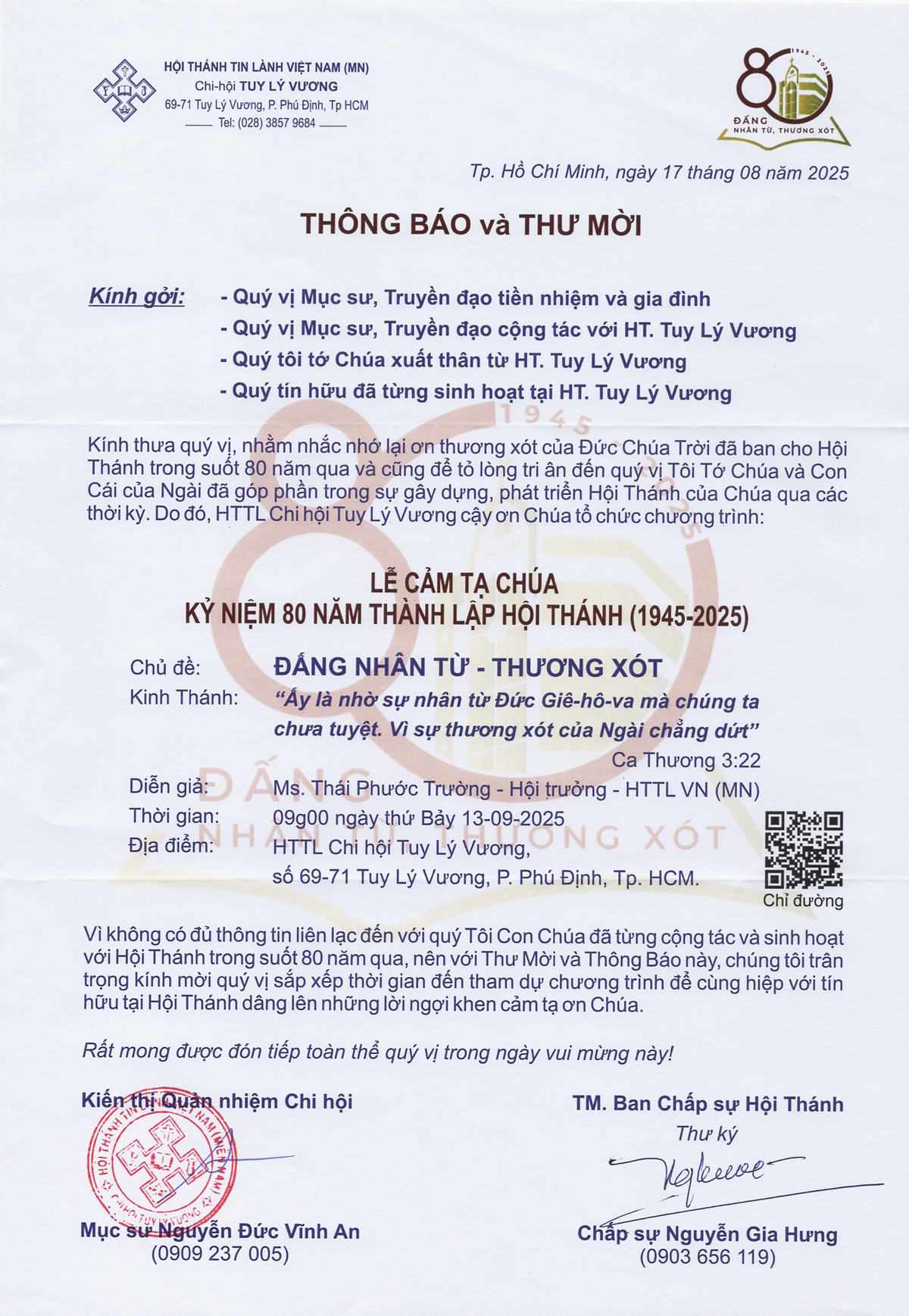 Thông Báo Thông Báo và Thư Mời V/v Lễ Cảm Tạ Chúa Kỷ Niệm 80 Năm Thành Lập HTTL TUY LÝ VƯƠNG 25/08/2025 4002