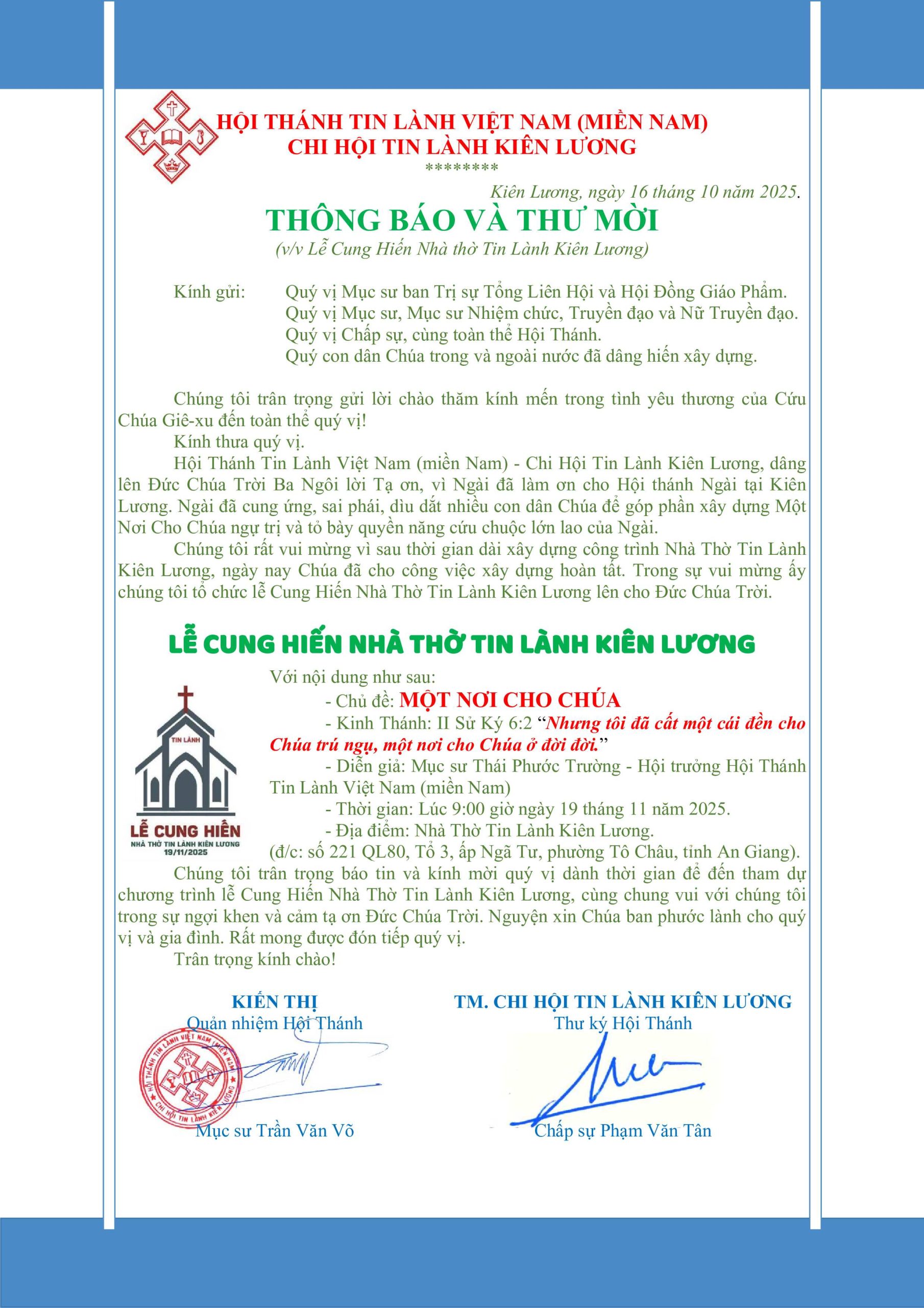 Thông Báo và Thư Mời V/v Lễ Cung Hiến Nhà Thờ Tin Lành KIÊN LƯƠNG