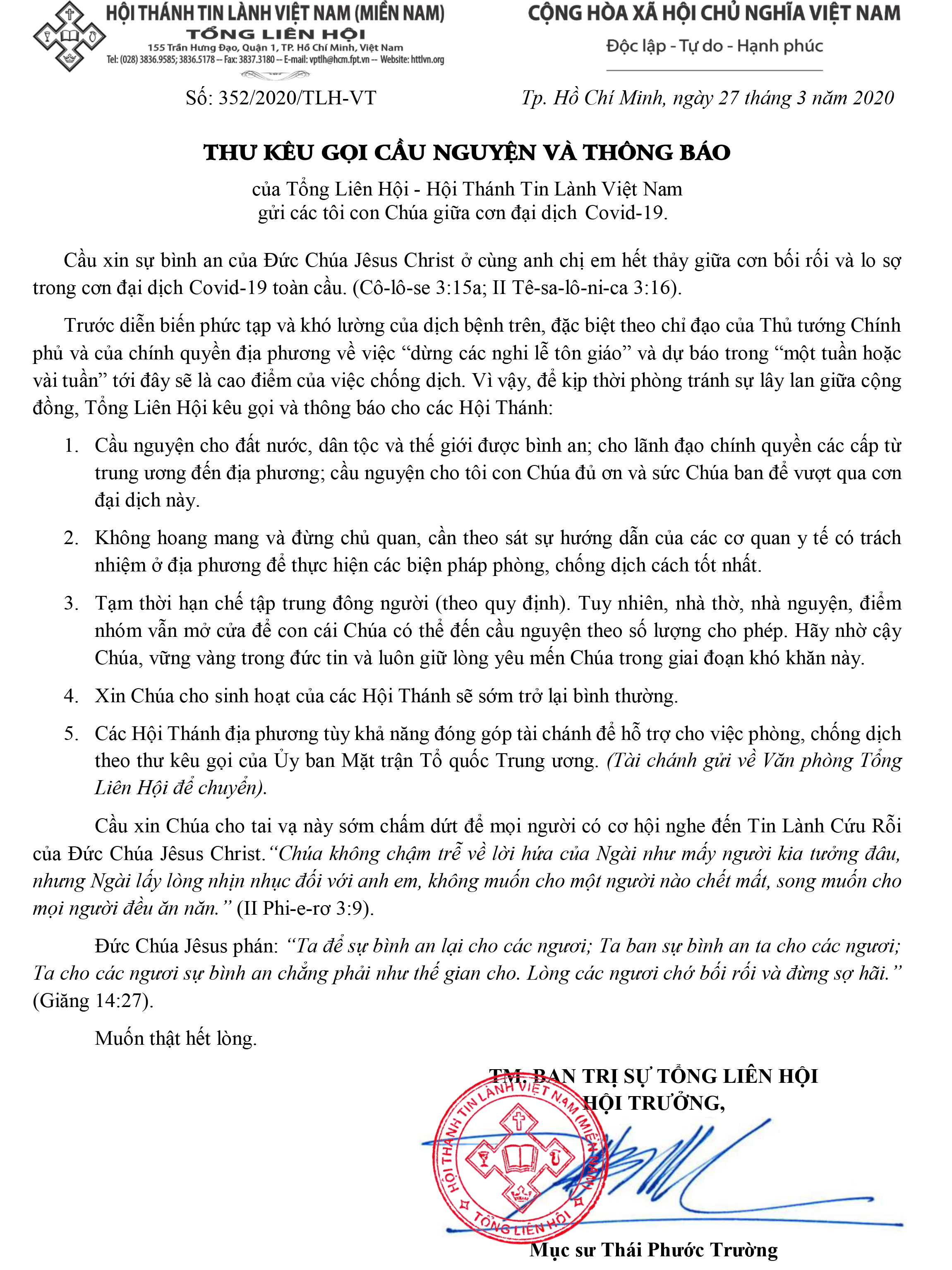 Thư Kêu Gọi Cầu Nguyện Và Thông Báo Về Đại Dịch Covid-19
