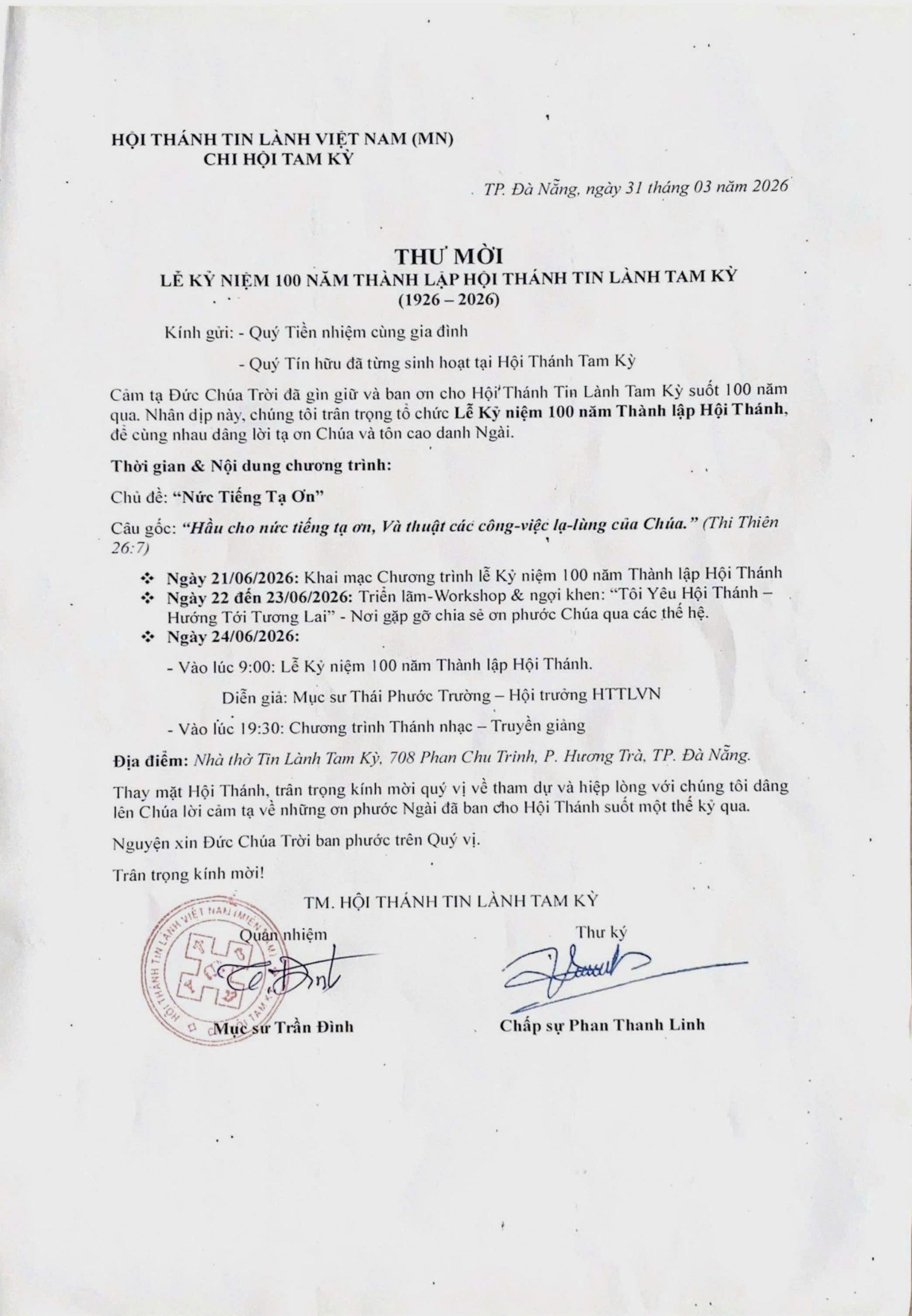 Thư Mời Lễ Kỷ Niệm 100 Năm Thành Lập HTTL TAM KỲ (1926-2026)