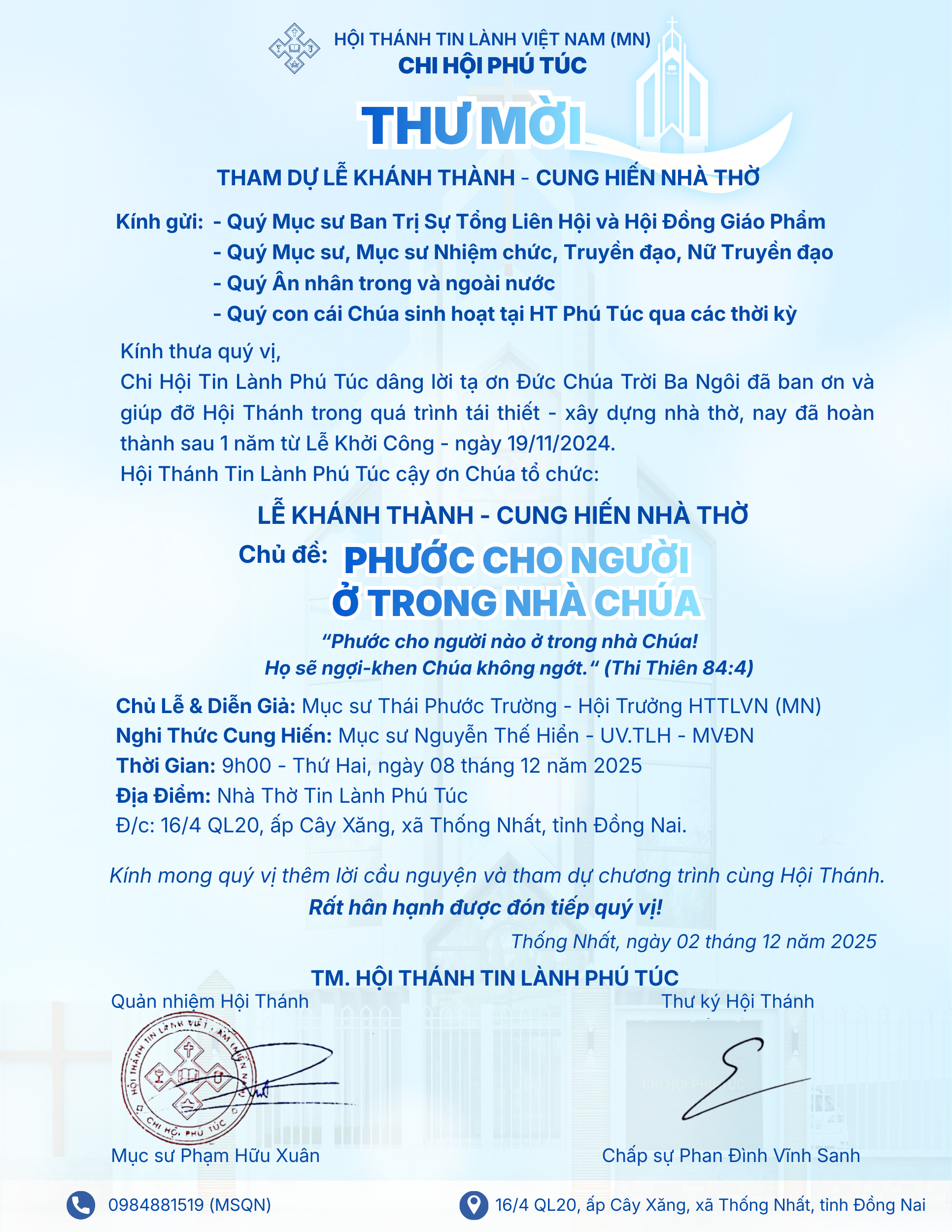 Thư Mời V/v Tham Dự Lễ Khánh Thành – Cung Hiến Nhà Thờ Tin Lành PHÚ TÚC