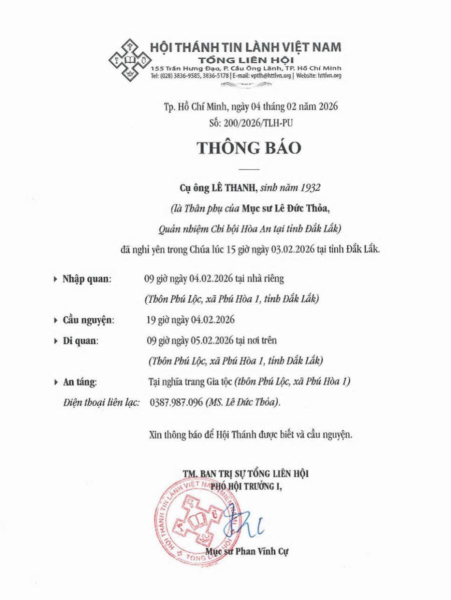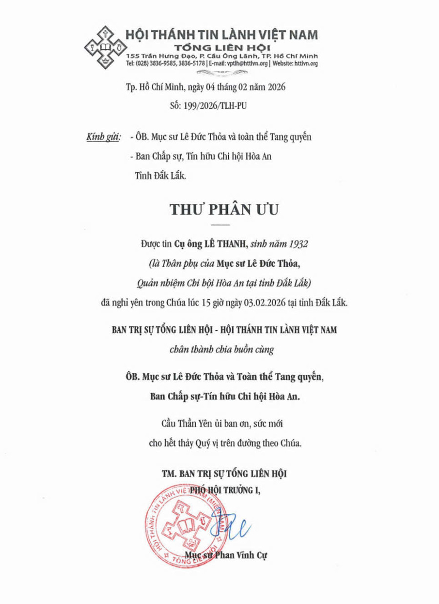 Thư Phân Ưu Cùng Tang Quyến Của Mục Sư Nhiệm Chức GIÀNG A HÒA