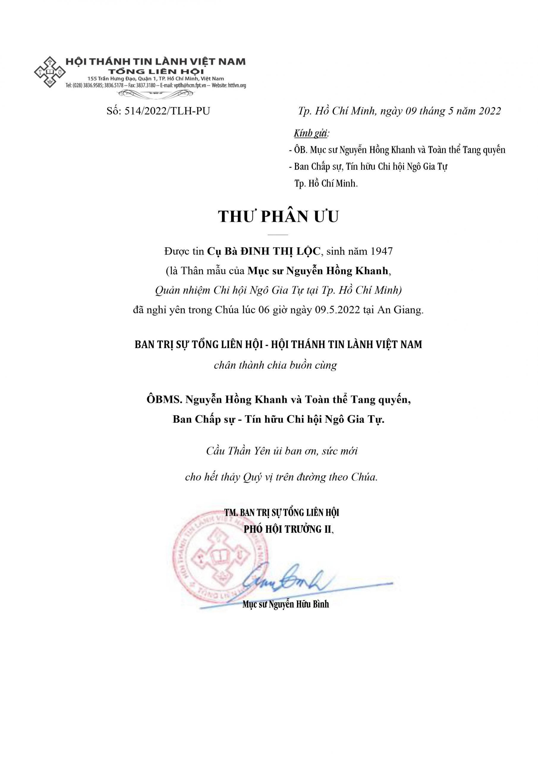 Thư Phân Ưu Cùng Tang Quyến Cụ Bà Đinh Thị Lộc