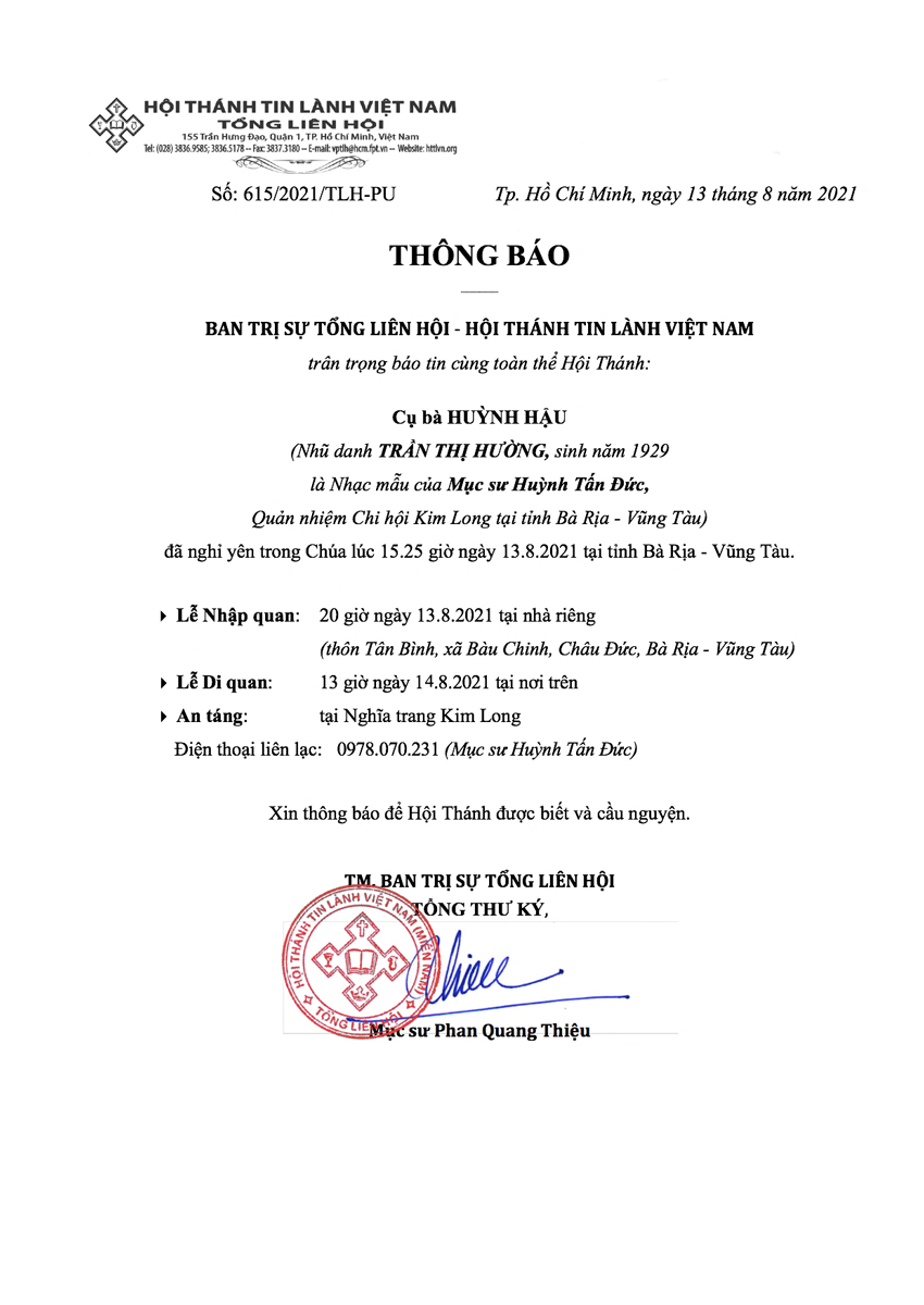 Thư Phân Ưu Cùng Tang Quyến Cụ Bà Huỳnh Hậu