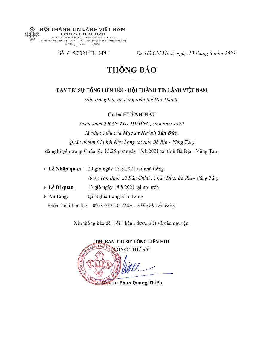 Thư Phân Ưu Cùng Tang Quyến Cụ Bà Huỳnh Hậu
