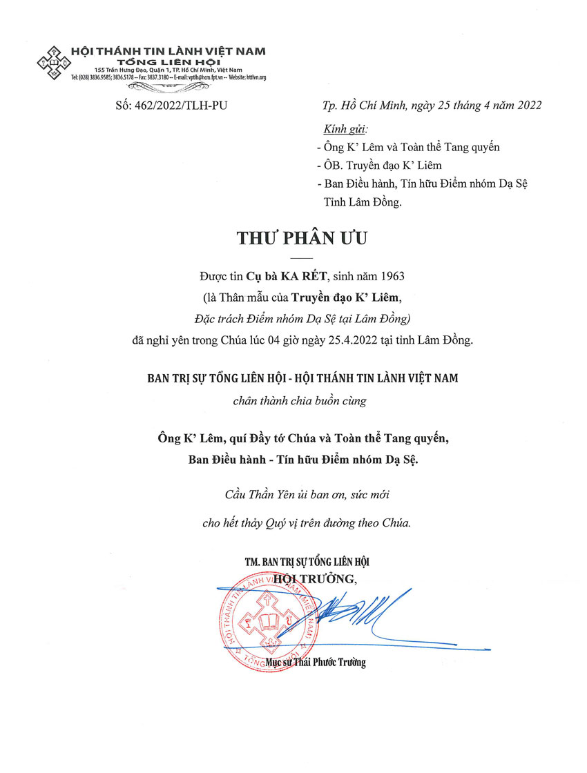 Thư Phân Ưu Cùng Tang Quyến Của Mục Sư Trí Sự HỒ VĨNH TỒN