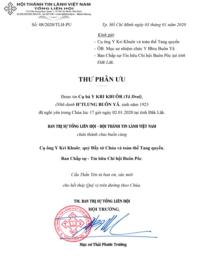 Thư Phân Ưu Cùng Tang Quyến Cụ Bà Y Kri Kbuôr (Yă Drul)