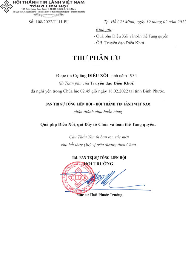 Thư Phân Ưu Cùng Tang Quyến Cụ Ông Điểu Xôi
