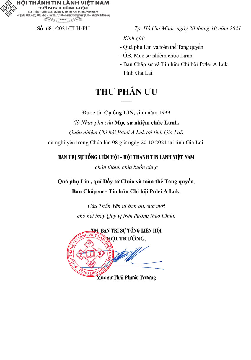 Thư Phân Ưu Cùng Tang Quyến Cụ Ông Lin (Gia Lai)