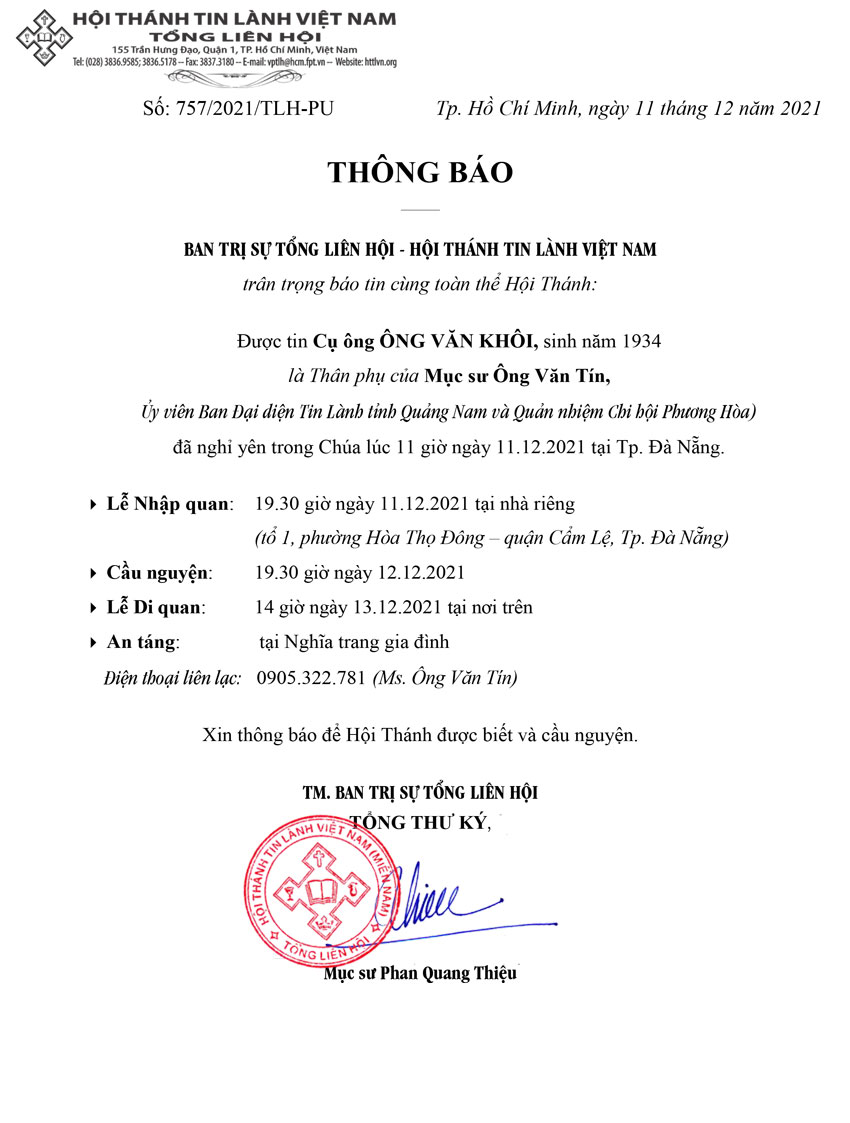Thư Phân Ưu Cùng Tang Quyến Cụ Ông ÔNG VĂN KHÔI
