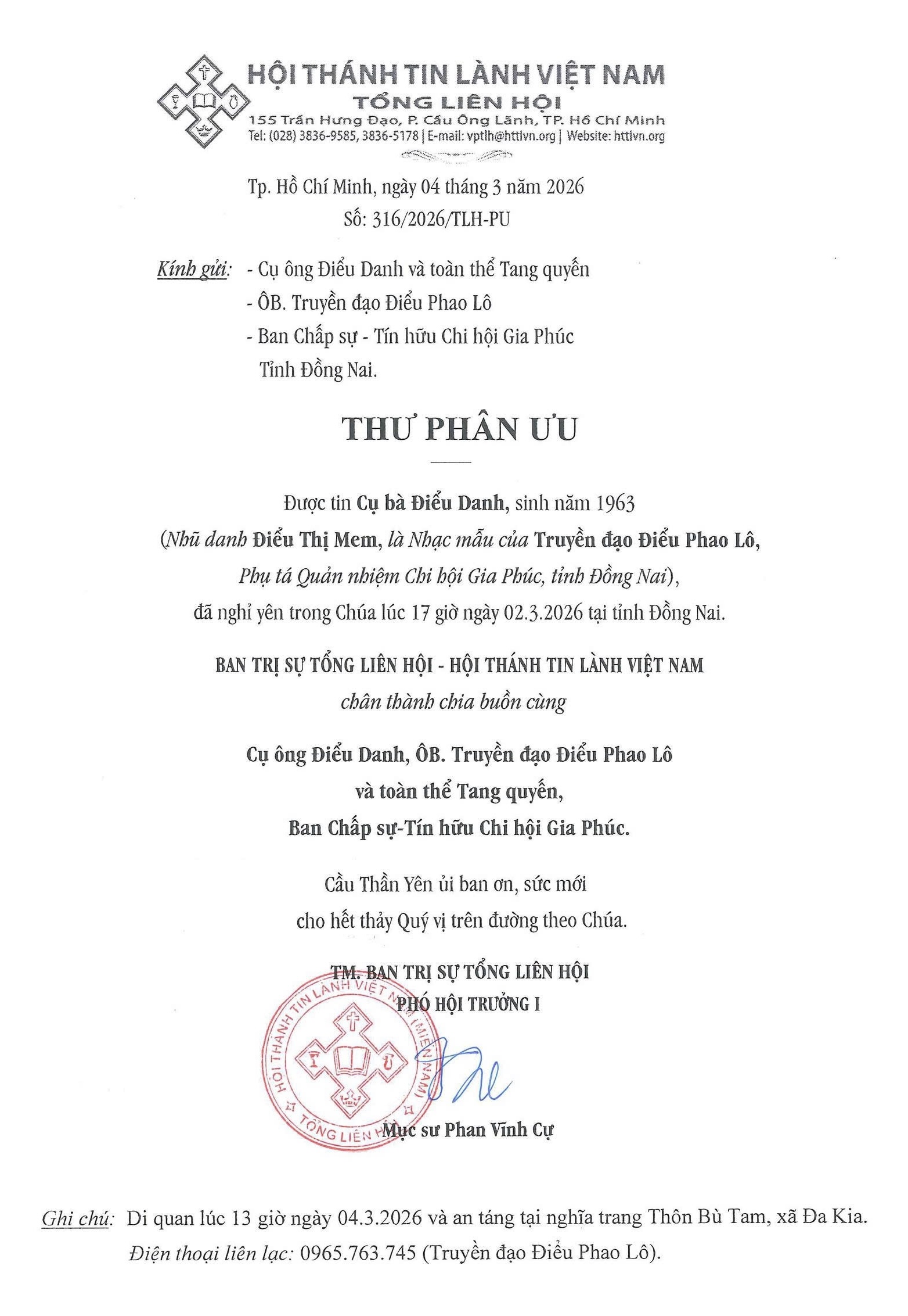 Thư Phân Ưu Cùng Tang Quyến Của Cụ Bà ĐIỂU DANH