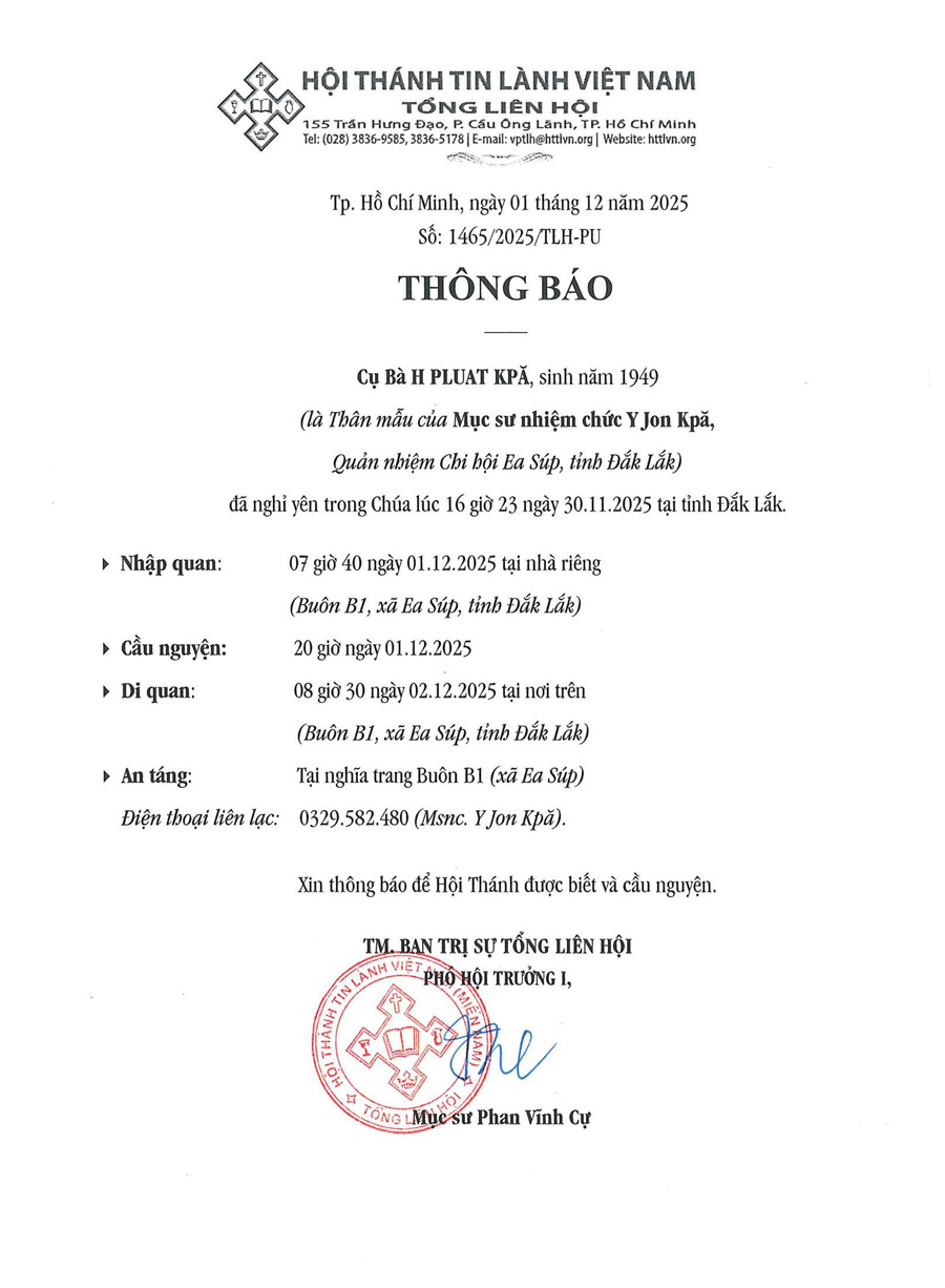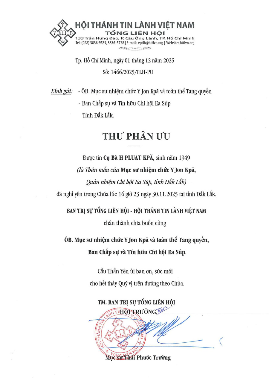 Thư Phân Ưu Cùng Tang Quyến Của Cụ Bà H PLUAT KPĂ