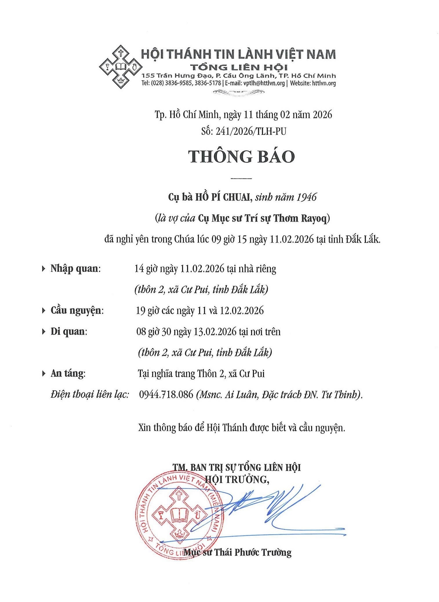 Thư Phân Ưu Cùng Tang Quyến Của Cụ Bà HỒ PÍ CHUAI