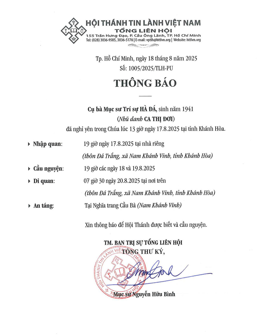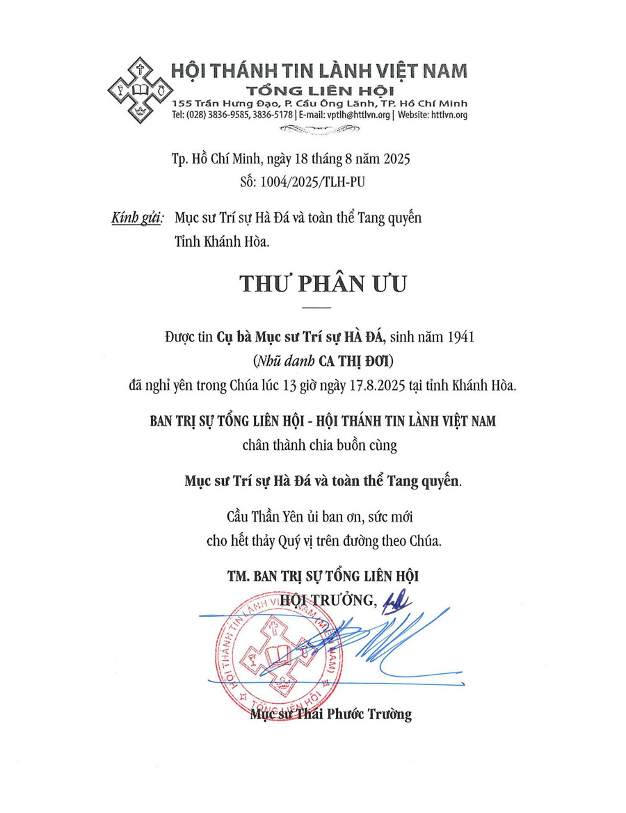 Thư Phân Ưu Cùng Tang Quyến Của Cụ Bà Mục Sư Trí Sự HÀ ĐÁ