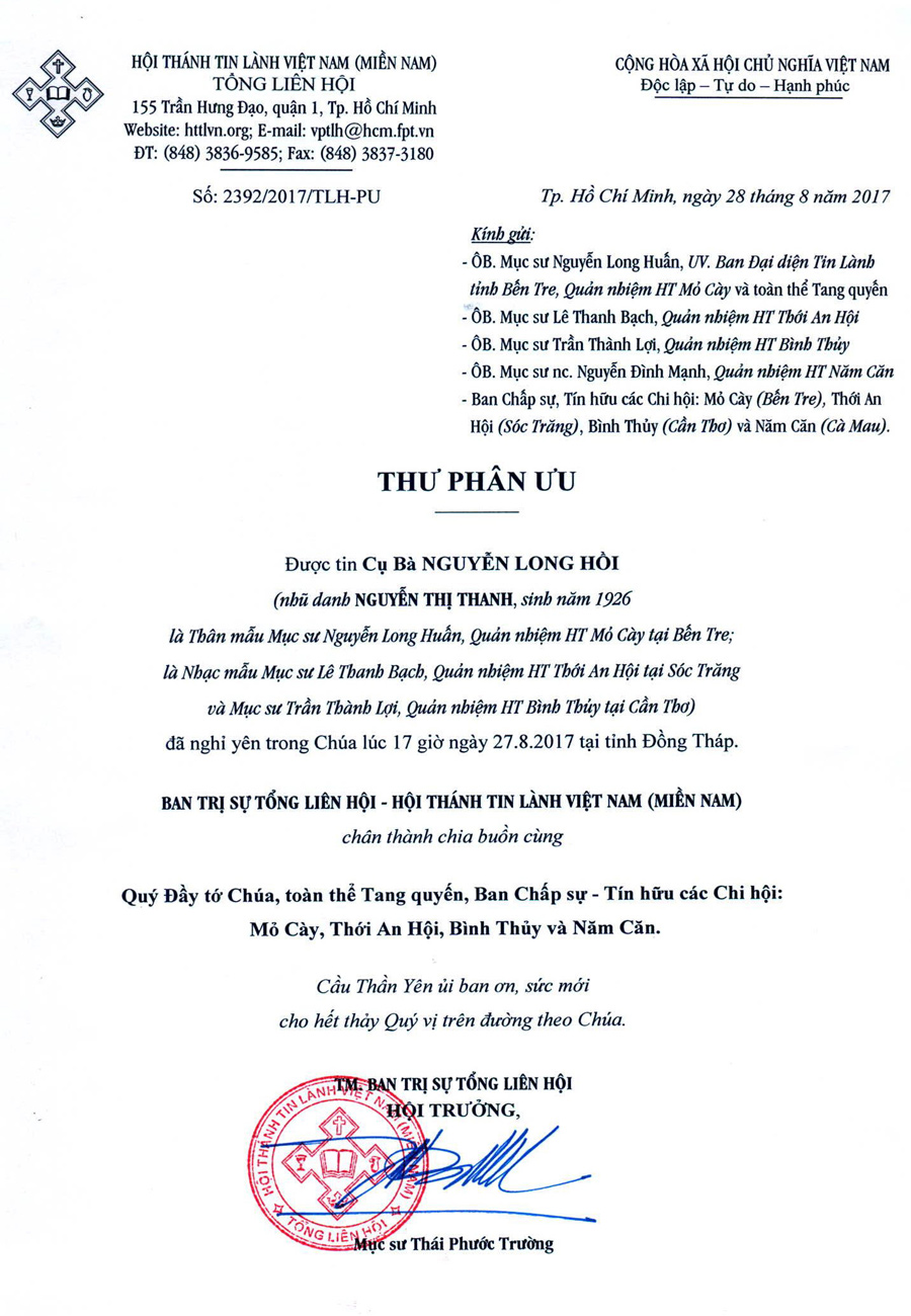 Thư Phân Ưu Cùng Tang Quyến Của Cụ Bà NGUYỄN LONG HỒI