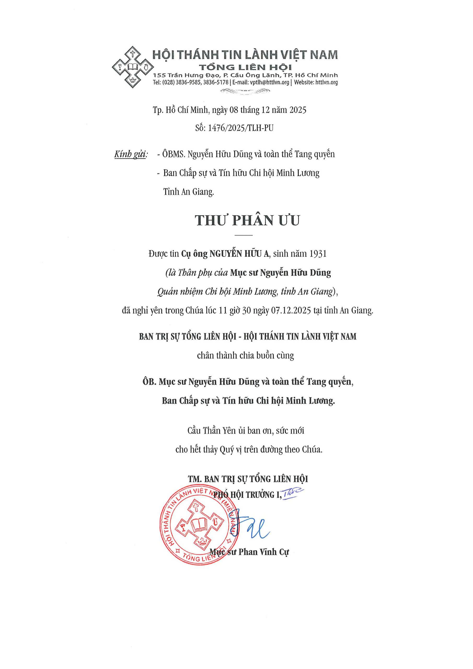 Thư Phân Ưu Cùng Tang Quyến Của Cụ Ông NGUYỄN HỮU A
