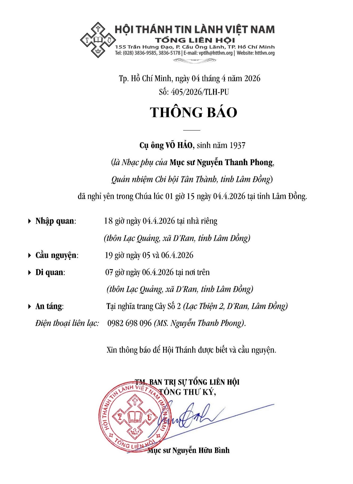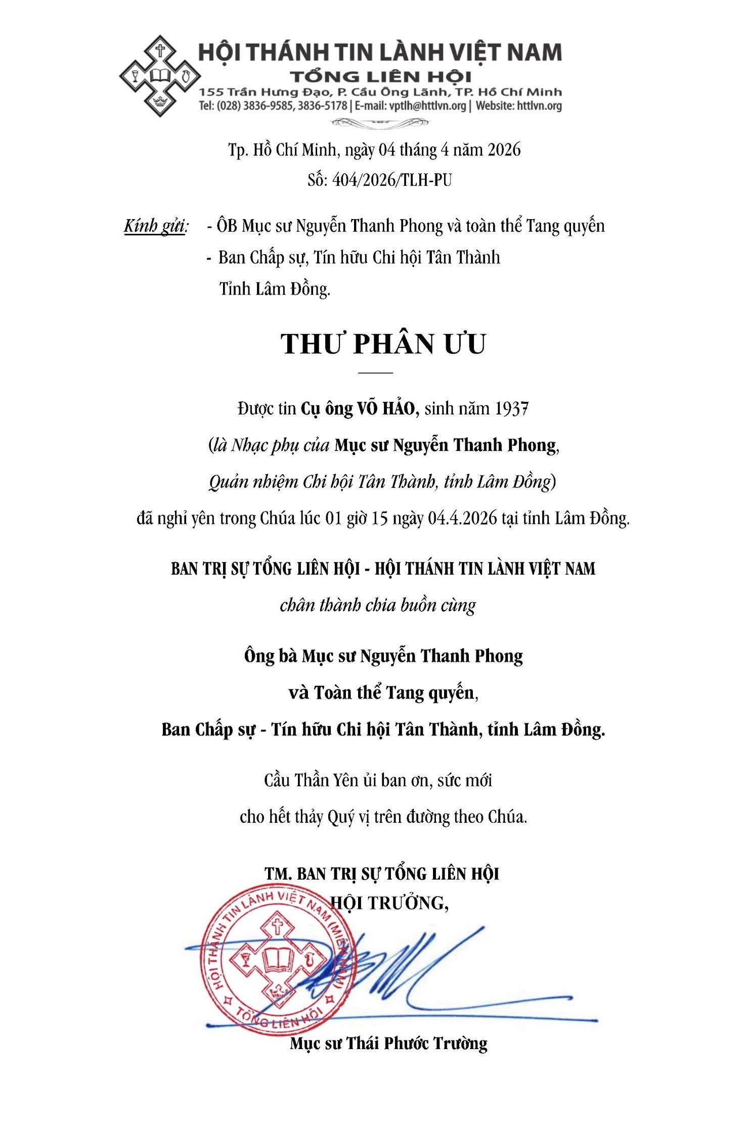 Thư Phân Ưu Cùng Tang Quyến Của Mục Sư Trí Sự HỒ VĨNH TỒN
