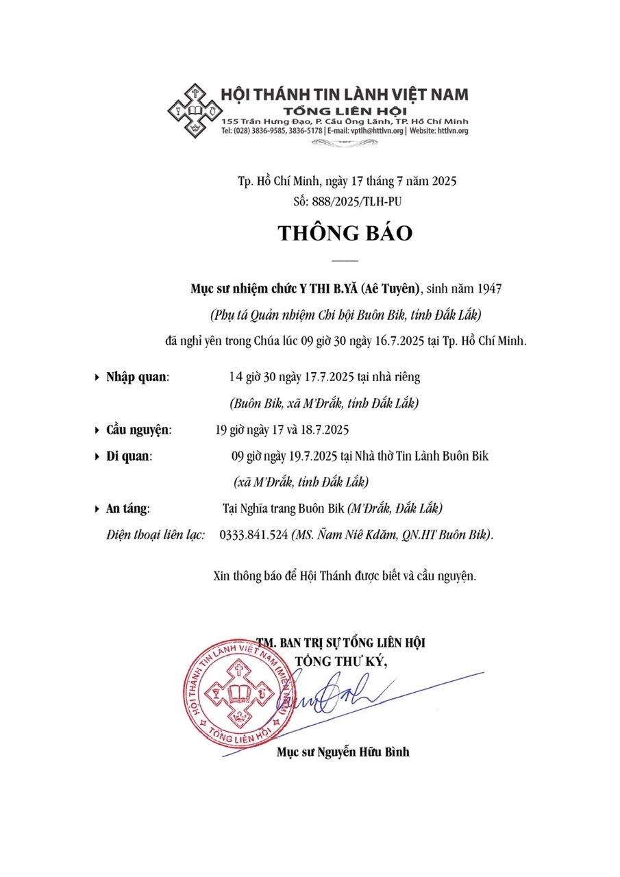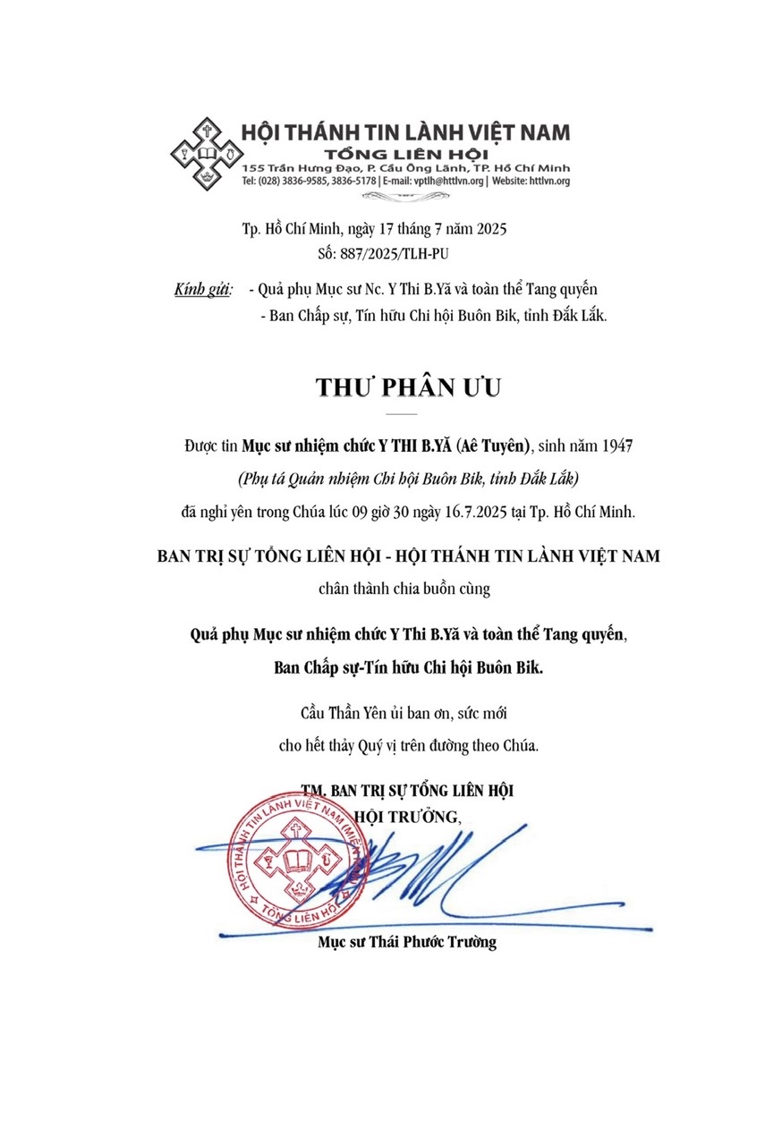 Thư Phân Ưu Cùng Tang Quyến Của Mục Sư Nhiệm Chức Y THI B.YĂ (Aê Tuyên)