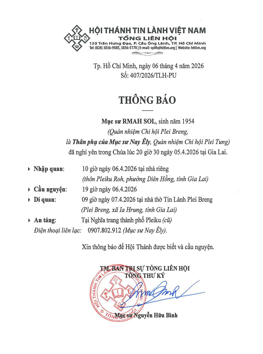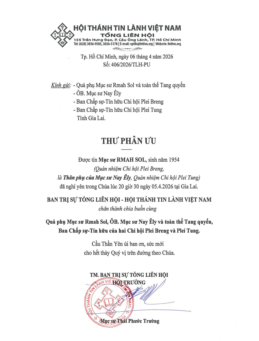 Thư Phân Ưu Cùng Tang Quyến Của Mục Sư RMAH SOL