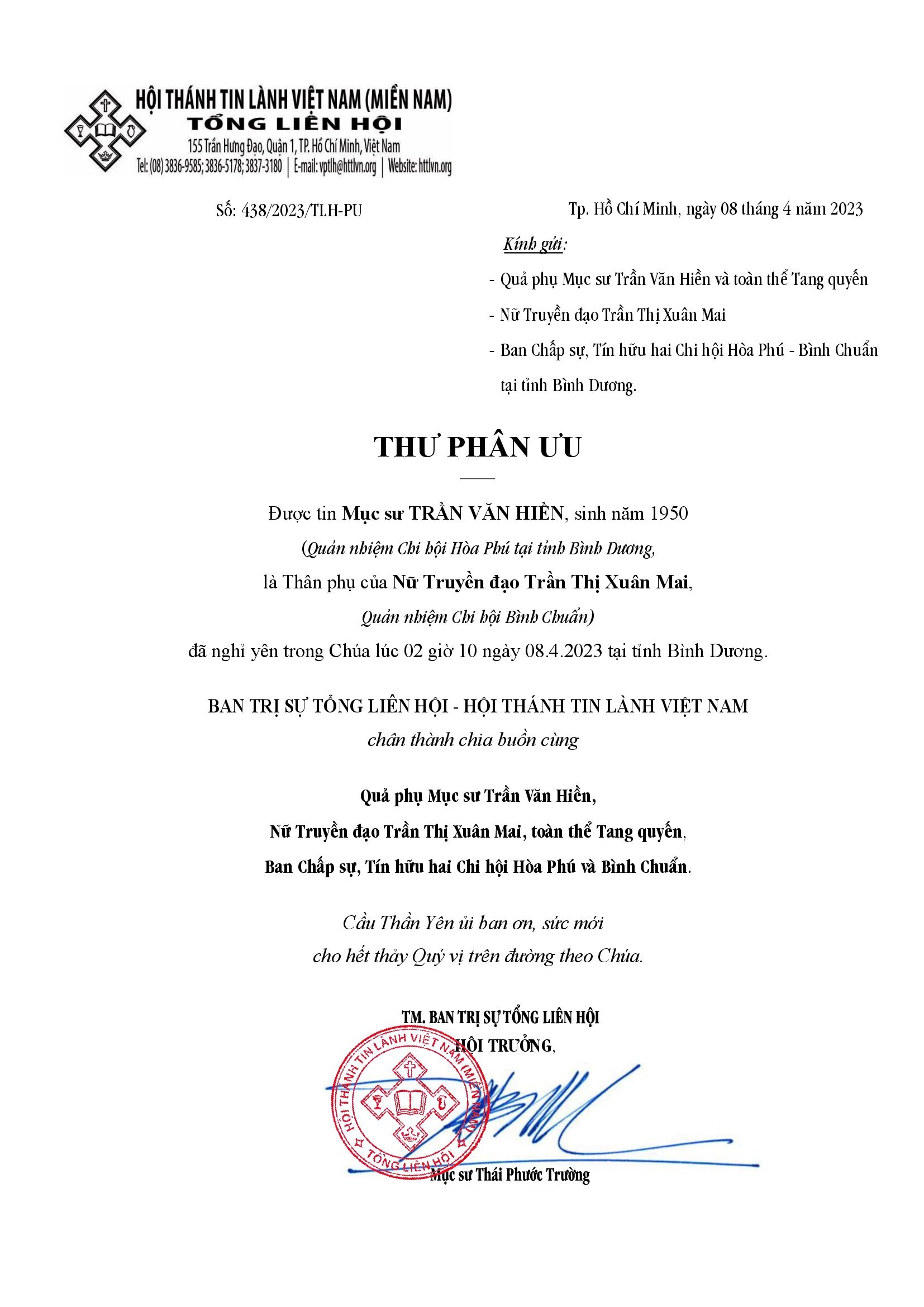 Thư Phân Ưu Cùng Tang Quyến Của Mục Sư Trần Văn Hiền