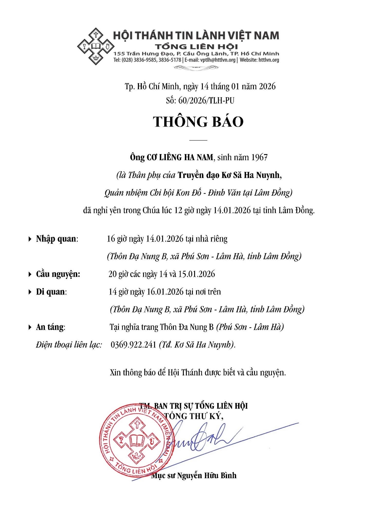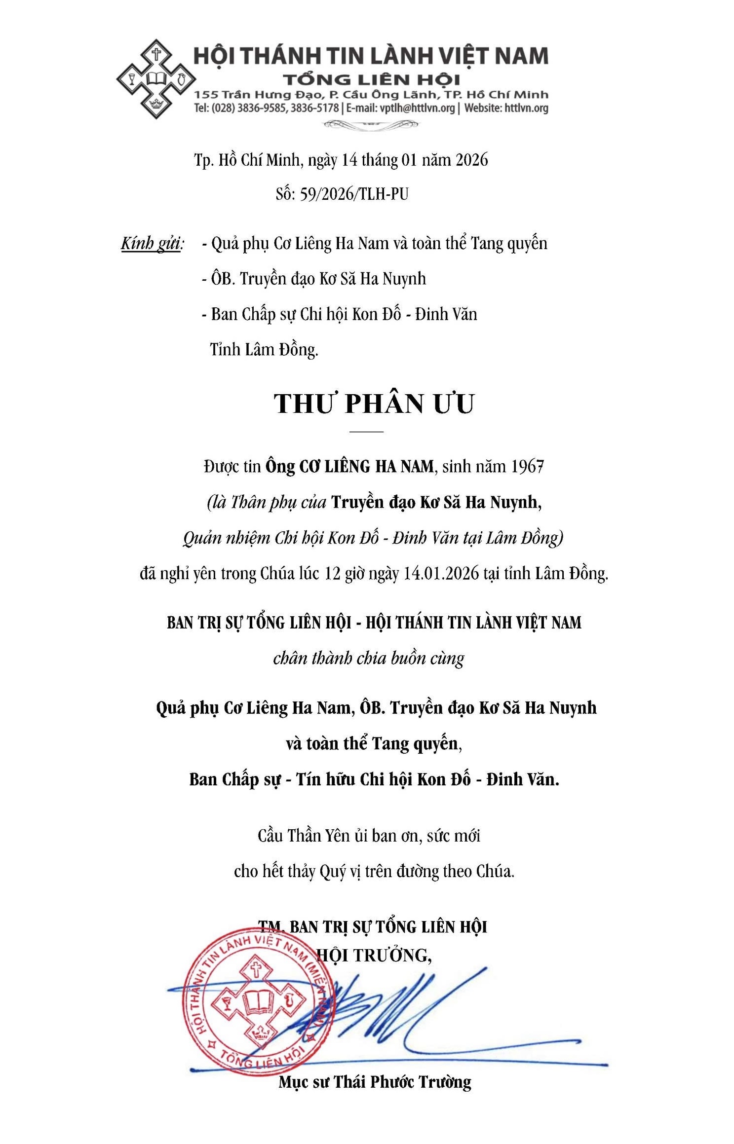 Thư Phân Ưu Cùng Tang Quyến Của Ông CƠ LIÊNG HA NAM