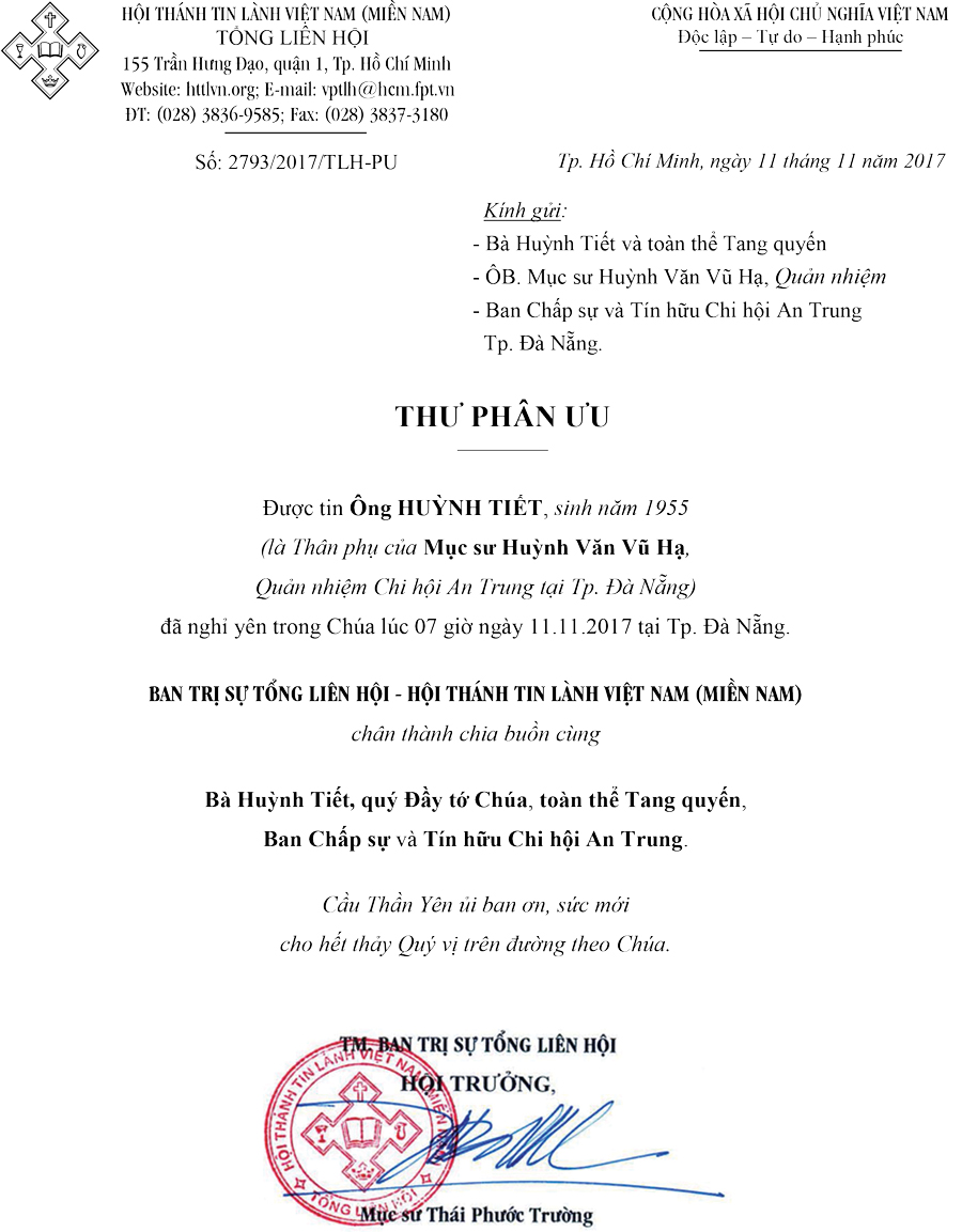 Thư Phân Ưu Cùng Tang Quyến Của Ông Huỳnh Tiết