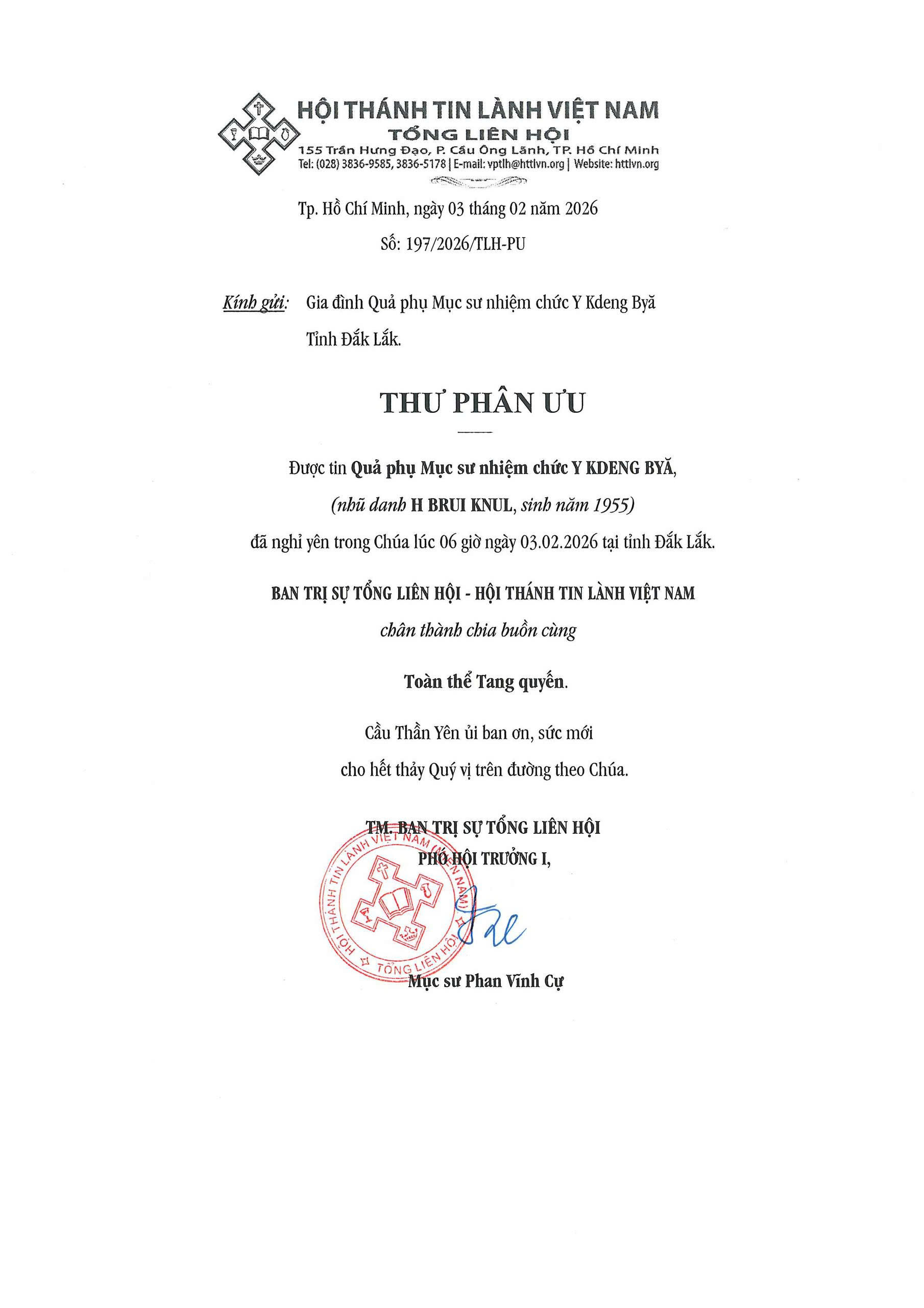 Thư Phân Ưu Cùng Tang Quyến Của Quả Phụ Mục Sư Nhiệm Chức Y KDENG BYĂ